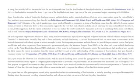 There is a view that the fiscal burden of food subsidies in India is unsustainable. Yet popular debate and discussion around the costs of these food subsidies, relative to their benefits, are misleading for two reasons. First, they typically treat reported budgetary subsidy estimates—i.e. the fiscal cost to the government of the distribution of food via ration shops—as equivalent to “transfers” to beneficiaries. Secondly, they tend to focus exclusively on consumers. In doing so, they neglect the two-part nature of the food distribution system, which includes payments to farmers at the time of procurement. This paper examines ways of measuring the costs and value of the food subsidy. We present estimates that combine the implicit value of benefits to consumers arising from the reduced price of grain sold to consumers via ration shops, with implicit benefits to farmers, in terms of the price difference between what farmers are paid by the government and what they would have obtained in the open market. This approach shows that each rupee of the “food subsidy” reported in government accounts represents a transfer worth Rs 1.29 to consumers and farmers, on average, over the period 2001–02 to 2022–23. That is, each rupee transferred to these groups is associated with a cost of Rs 0.79 to the government.