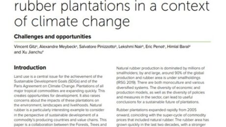 Land use is a central issue for the achievement of the Sustainable Development Goals (SDGs) and of the Paris Agreement on Climate Change. Plantations of all major tropical commodities are expanding quickly. This creates opportunities for development. It also raises concerns about the impacts of these plantations on the environment, landscapes and livelihoods. Natural rubber is a particularly interesting example to consider in the perspective of sustainable development of a commodity’s producing countries and value chains. This paper is a collaboration between the Forests, Trees and Agroforestry (FTA) research program of the CGIAR (FTA n.d.) and the International Rubber Study Group (IRSG) (IRSG n.d.). FTA works across a range of plantations, value chains and tree crop commodities, from timber, palm oil, cacao, coffee and tea to bamboo, rattan and rubber, among others. It has identified plantations, their development and sustainability as a research priority. IRSG is an intergovernmental organization and the primary source of statistical information related to rubber value chains, policy issues, innovation and technology. IRSG has a leading role in developing a comprehensive agenda for the sustainability of natural and synthetic rubber.