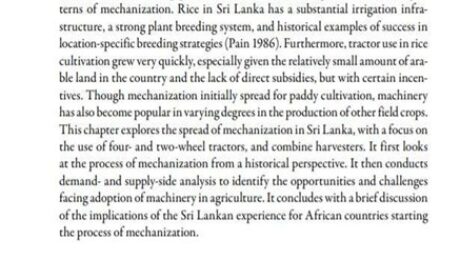 Sri Lanka’s unique geography and its distinct experiences with machine use in rice and field crop production offer valuable insights into different patterns of mechanization. Rice in Sri Lanka has a substantial irrigation infrastructure, a strong plant breeding system, and historical examples of success in location-specific breeding strategies (Pain 1986). Furthermore, tractor use in rice cultivation grew very quickly, especially given the relatively small amount of arable land in the country and the lack of direct subsidies, but with certain incentives. Though mechanization initially spread for paddy cultivation, machinery has also become popular in varying degrees in the production of other field crops. This chapter explores the spread of mechanization in Sri Lanka, with a focus on the use of four- and two-wheel tractors, and combine harvesters. It first looks at the process of mechanization from a historical perspective. It then conducts demand- and supply-side analysis to identify the opportunities and challenges facing adoption of machinery in agriculture. It concludes with a brief discussion of the implications of the Sri Lankan experience for African countries starting the process of mechanization.