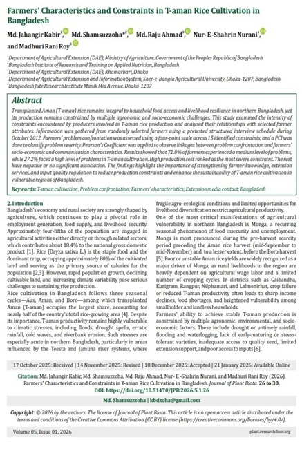 Transplanted Aman (T-aman) rice remains integral to household food access and livelihood resilience in northern Bangladesh, yet its production remains constrained by multiple agronomic and socio-economic challenges. This study examined the intensity of constraints encountered by producers involved in T-aman rice production and analysed their relationships with selected farmer attributes. Information was gathered from randomly selected farmers using a pretested structured interview schedule during October 2012. Farmers’ problem confrontation was assessed using a four-point scale across 15 identified constraints, and a PCI was done to classify problem severity. Pearson’s Coefficient was applied to observe linkages between problem confrontation and farmers’ socio-economic and communication characteristics. Results showed that 72.8% of farmers experienced a medium level of problems, while 27.2% faced a high level of problems in T-aman cultivation. High production cost ranked as the most severe constraint. The rest have negative or no significant association. The findings highlight the importance of strengthening farmer knowledge, extension services, and input quality regulation to reduce production constraints and enhance the sustainability of T-aman rice cultivation in vulnerable regions of Bangladesh.